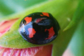 - カメノコテントウ・・・赤と黒の亀の甲状の模様が特徴的なテントウムシ。広葉樹林や河畔林などで見られ、オニグルミなどのクルミハムシやドロノキハムシの幼虫を食べる。