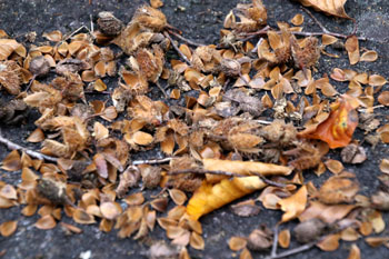 - クリを食べた残骸・・・クマは、口で噛み砕き、皮だけツルリと吐き出す。よく見ると、クマの歯形もついているので、犯人はクマだと分かる。