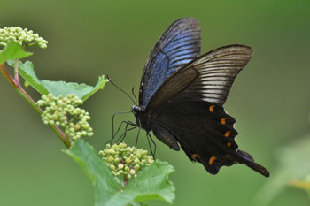 - コクサギを食草とするカラスアゲハ(写真:ヤブガラシの蜜を吸うカラスアゲハ)・・・山地の渓流沿いでよく見られるアゲハチョウの仲間。ハネの表は緑色の金属光沢があるが、ミヤマカラスアゲハに比べると地味。幼虫は、コクサギなどのミカン科植物の葉を食べて育つ。