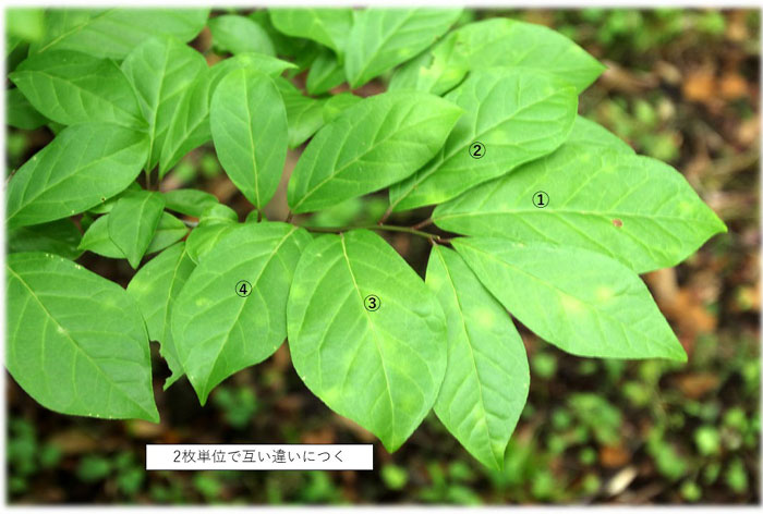 - コクサギ型葉序・・・葉の配列は、枝に左左、右右、左左・・・と2枚づつ交互に並ぶ独特なもので、「コクサギ型葉序」と名付けられている。