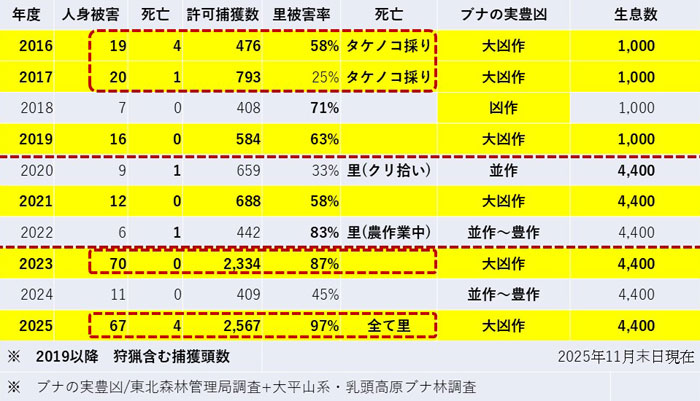 - 2023年及び2025年の異常出没によって、クマは「人の生活圏に来れば美味しい食べ物が山ほどある」と既に学習している。だからクマ対策の難度は年々高くなっている。