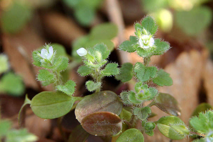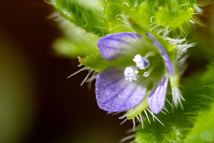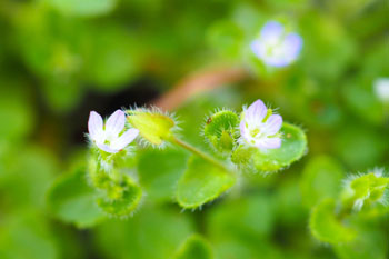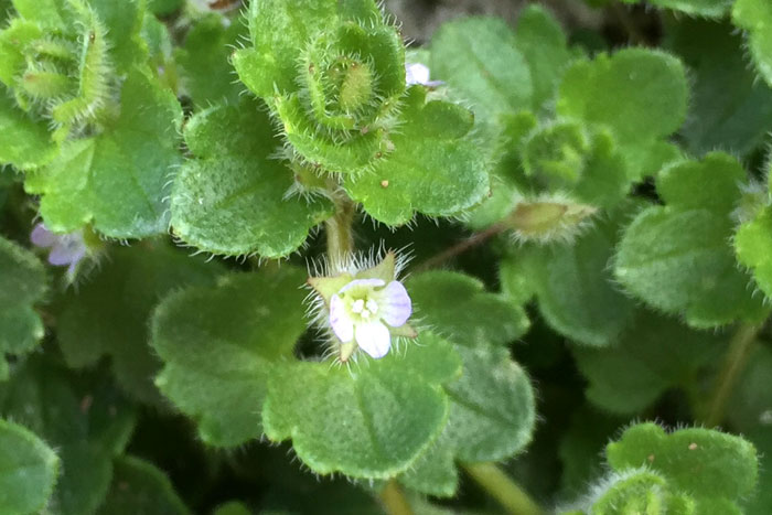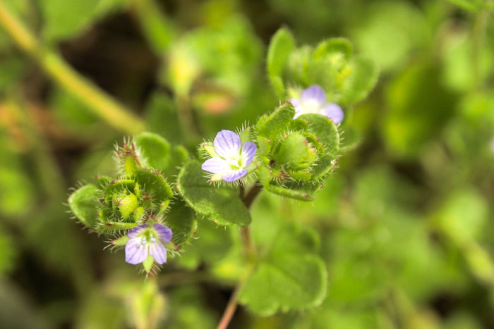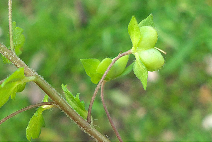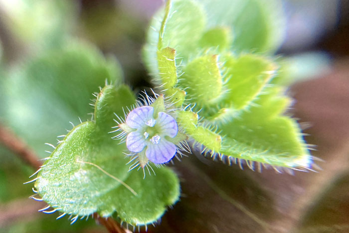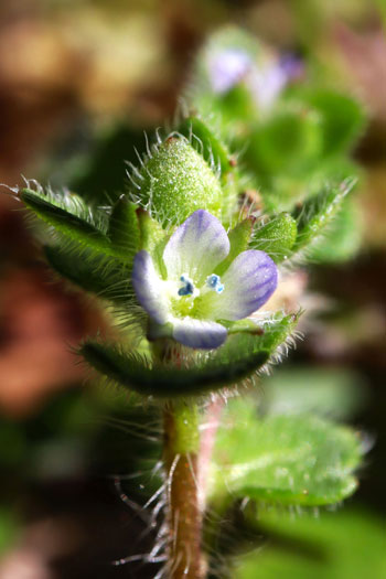 ヨーロッパ原産の帰化植物。道端や林、空き地などにひっそり咲いている。オオイヌノフグリに似ているが、花は小さく控えめで、茎や葉に白い毛がフサフサと生えている点で見分けられる。全体になよなよした印象で、茎は細く上には伸びず、地を這うように広がっていく。花の後にできる実は、丸っこく、4筋のくびれが見られる。中に3~4個の種が入っている。