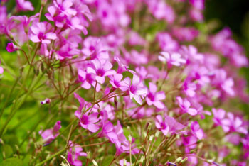 - 花・・・葉より高い花茎を出し、5弁の赤紫色の花を多数つける。花の中心部が濃い紫色で葯は黄色、花粉を出す。時に白い花を咲かせる株もあり、シロバナフシネハナカタバミまたはシロバナイモカタバミと呼ばれている。
