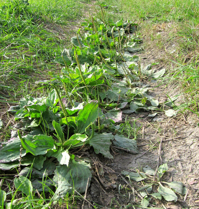 道端や空き地、農村の畑の脇道など、人がよく通り、踏みつけるような場所にたくましく生きる雑草の代表。車に踏み潰されたくらいでは死なない。長い棒状の花茎を出して、花が穂状にたくさんつく。最初、白い糸状の雌花が下から上に向かって咲いていく。咲き終わると、今度は雄花が咲き出す。つまり同花受粉を避けるために、雌花と雄花が咲く時期をずらしている。主に日本海側に生え、全体に白くて柔らかい毛が密生するのはエゾオオバコである。日本中に分布。