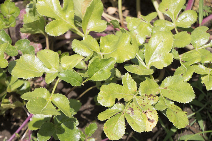 - 葉・・・楕円形の小葉または3裂した小葉が集合して1つの葉を構成し、ロゼット状に並ぶ。葉は厚くて光沢がある。