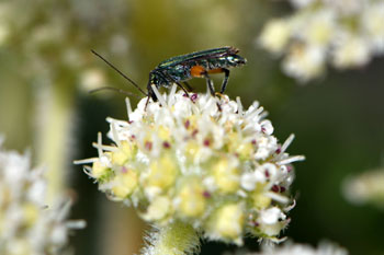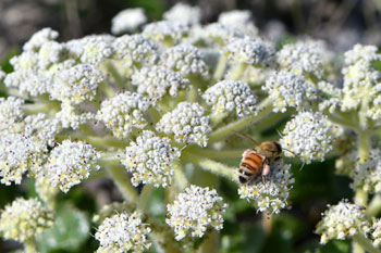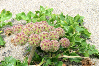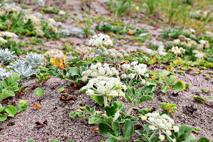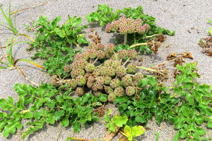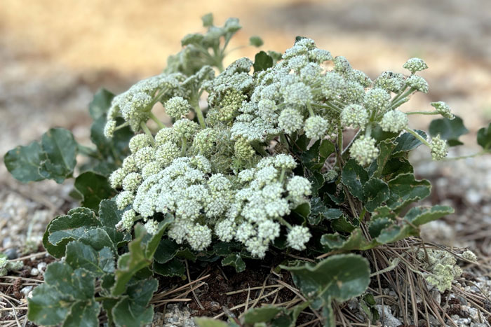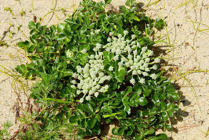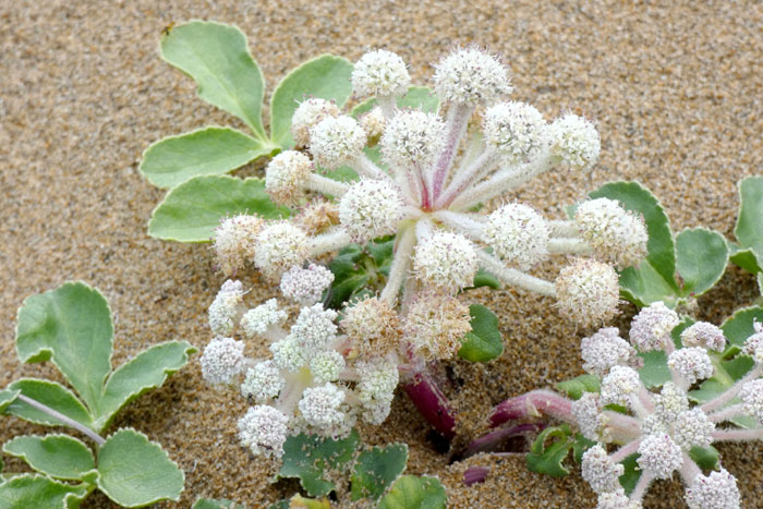 - 花・・・花茎の先に複散形花序をつくり、白色の小花が多数集まって咲く姿は、砂地に散った線香花火のようにも見える。