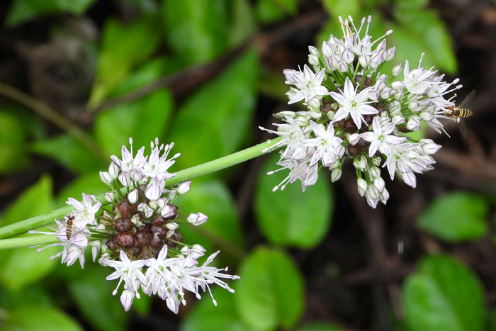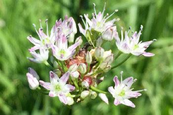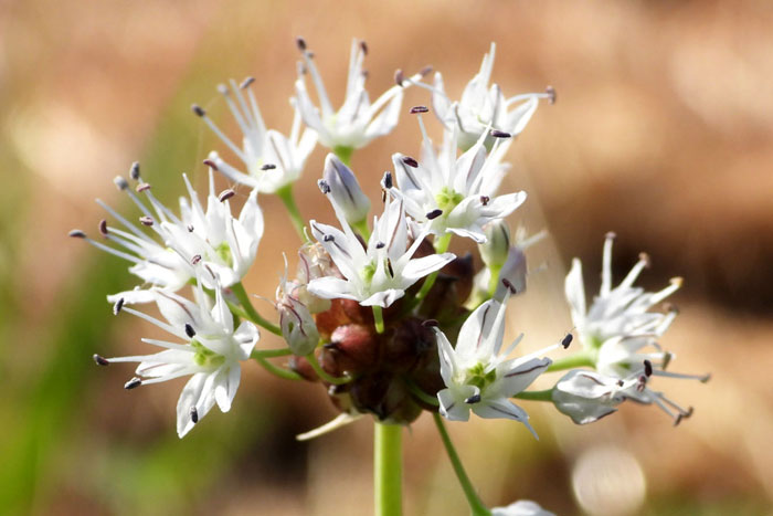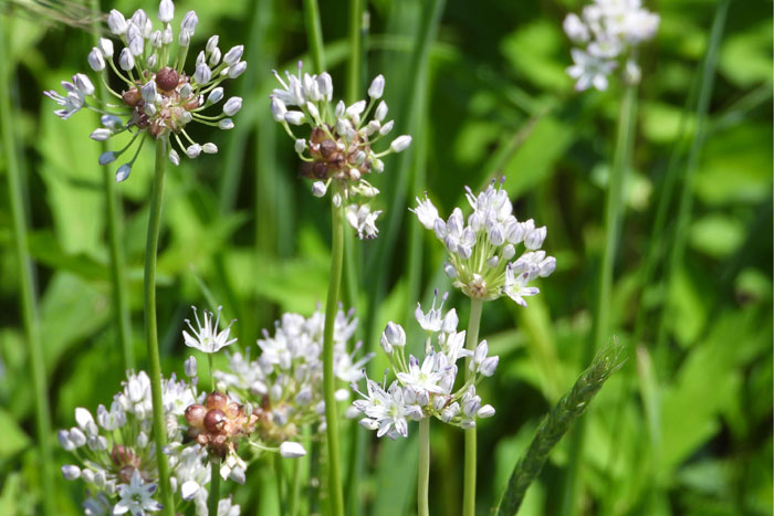 - 花・・・花茎の先端に球形の散形花序を1個つける。淡い紅紫色を帯びる白色。花被片は6個で、淡い紫色の筋がある。