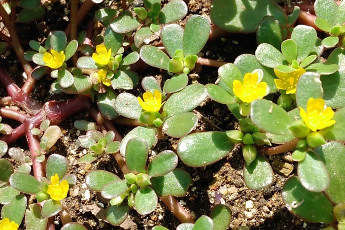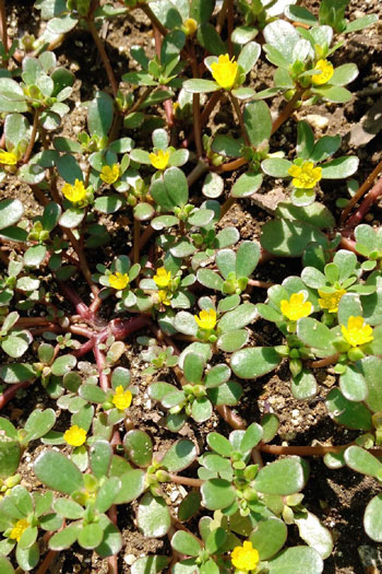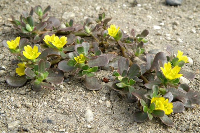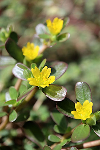- 名前の由来・・・葉を親指と人差し指とでつぶすと、ヌルリとした葉肉が現れて、指が「滑る」草であり、実が「ヒユ」の実に似ていることから、「スベリヒユ」の名がついた。