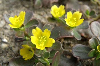 - 花・・・枝の先に小さな黄色の花を3~4個つける。5つの花弁は、先端の中央がへこむ。花は、日か当たると開き、午後には閉じる。