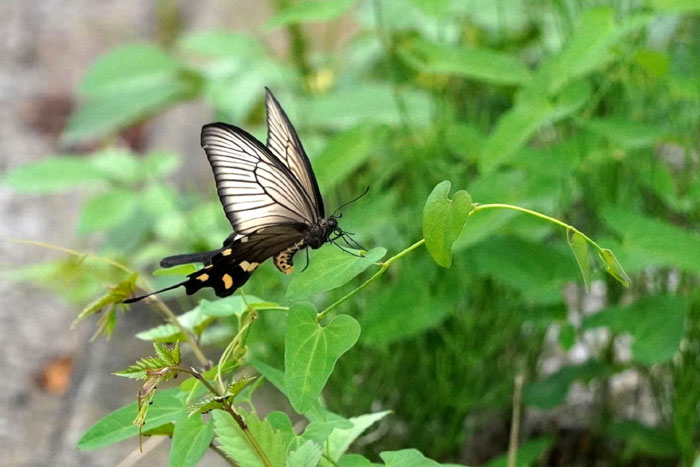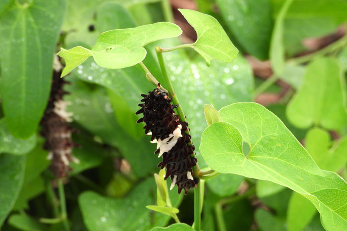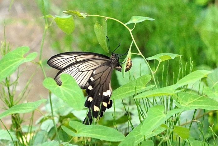 - ジャコウアゲハの食草・・・幼虫は、ウマノスズクサという毒のある草を食べ、体内に毒を蓄積する。この毒は成虫になっても体内に残り、ジャコウアゲハを食べた捕食者は中毒をおこすと考えられている。このように食草の毒を蓄えることを「選択的蓄積」という。