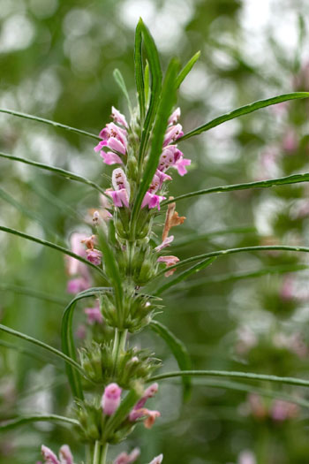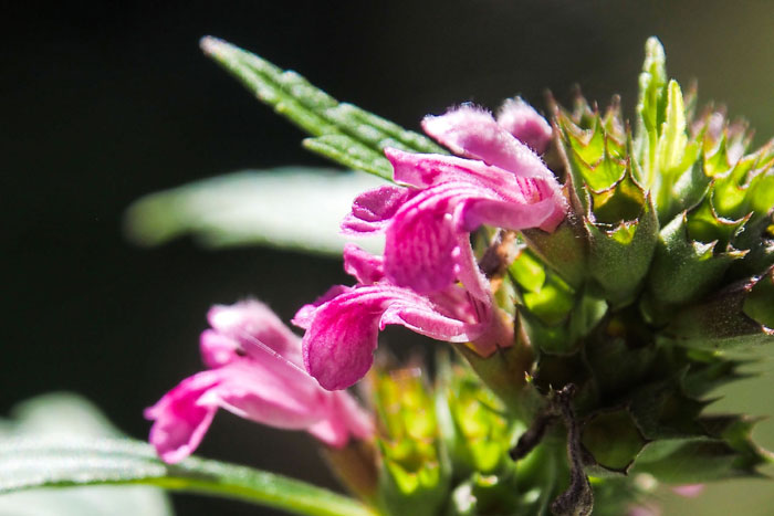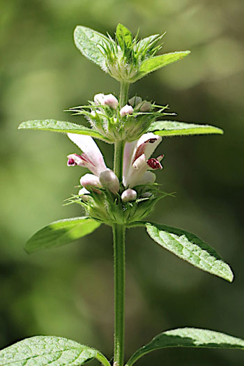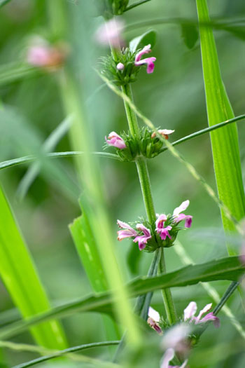 - 花・・・紅紫色の唇形花を数個ずつ輪状につける。花冠は上下に2裂し、下唇はさらに3裂して内部は濃い紅紫色になる。