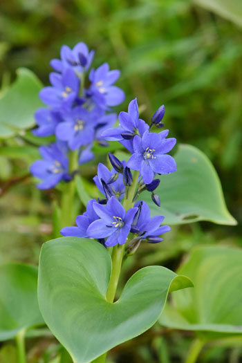田んぼや沼地、湿地、放棄水田などに生える。古くはナギと呼び、この葉を食用にした。農薬や土地開発、水質汚染、河川改修工事などによって、数は極端に減っている。全国39都道府県で絶滅危惧種に指定され、本県でも絶滅危惧Ⅱ類に指定されている。花は、一日花で美しく、青紫色で気品がある。雄しべの1本だけが特に大きい。葉は柄があり、ハート形で光沢がある。北海道から九州に分布。