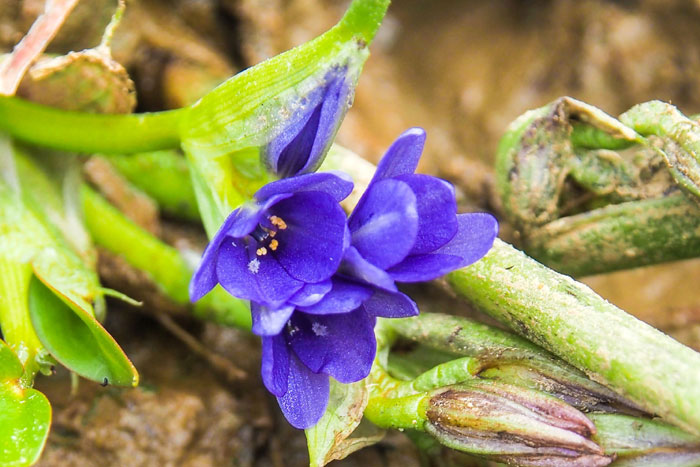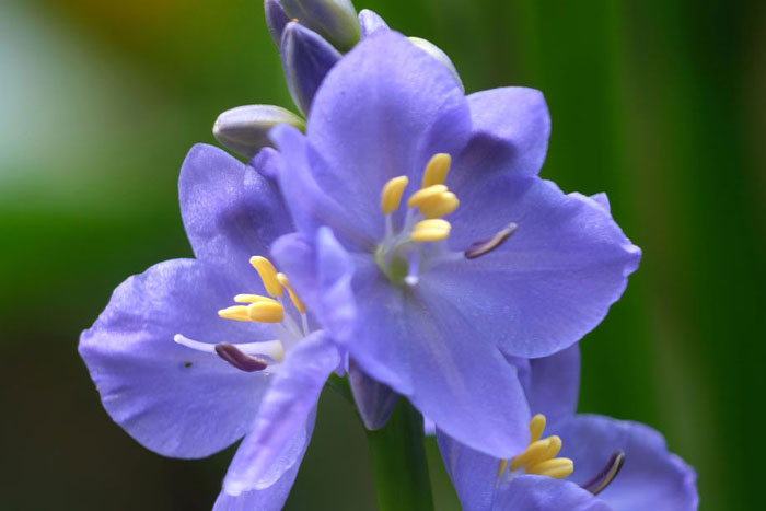 - 花・・・1つの花序に柄の短い花を2~8個つける。花冠は青紫色の釣鐘型で、花被片は6個。雄しべは6個、そのうち5個は短く葯が黄色で、1個はやや長く青紫色。