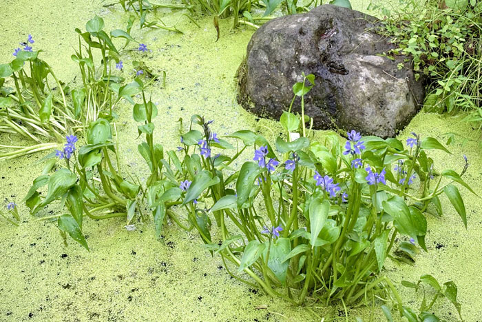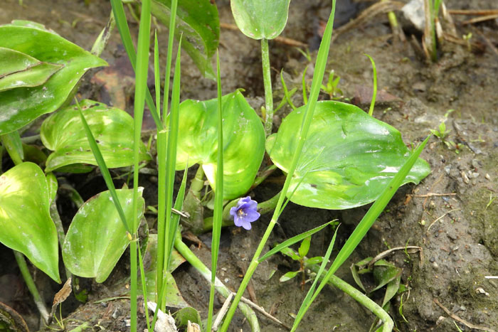 - ミズアオイとコナギの見分け方・・・ミズアオイは花が葉よりも高く伸びて咲くのに対し、コナギは葉の下に隠れるように花を咲かせまる。ミズアオイは全体的に大きく、コナギは小型である。