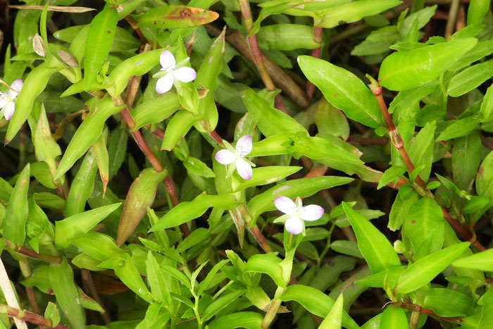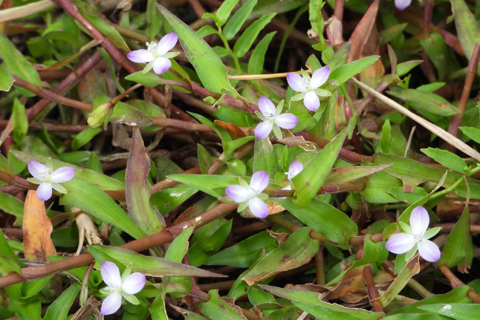 水田の土手や溝などの湿った場所に生える。茎は多肉質で軟らかい。よく分岐しながら泥の上を横に這い、各節からヒゲ根を出し、上部に立ち上がる。花は、葉の付け根に一つずつ咲くが、一日でしぼんでしまう。雄しべは6本だが、うち3本は単なる飾りの仮雄しべである。本州から沖縄に分布。