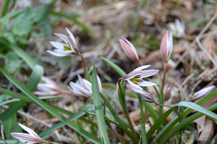 日当りの良い土手や山地の芝草原、川の傍の原野などに生えるチューリップの仲間。2枚の細長い葉を地面に広げ、その中心から花茎を伸ばす。花は1個が普通だが、稀に2個咲かせるものもある。日が当たると開くが、雨の日や曇りの日は閉じたままである。葉は白っぽい緑色をしている。秋田では絶滅危惧種1A類に指定されている。昔は、鱗茎を食用や滋養強壮の薬として使われた。東北地方以西から九州に分布。
