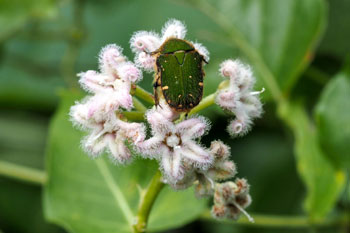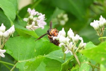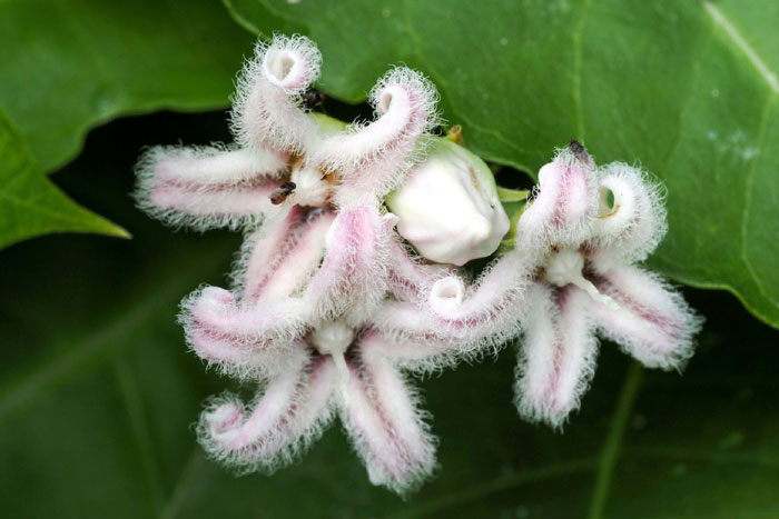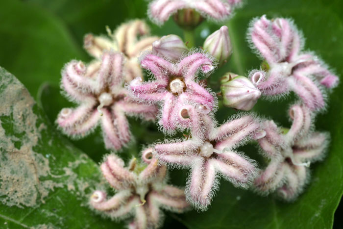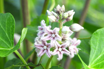 - 花・・・円錐花序を出し、淡い紅紫色の花を固まってつける。花冠は深裂し、内部に長い白毛が密生する。ねじれた柱頭は長く、花冠から突き出る。近づくとバニラのような甘い香りがする。