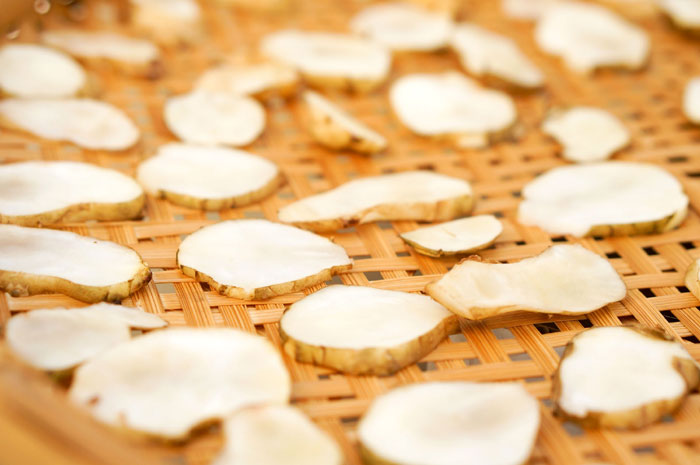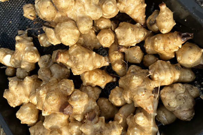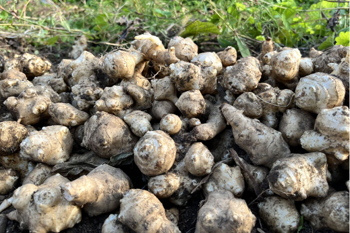 - 食用・・・地上部が枯れてからシャベルで掘り取り、よく洗って泥を落とす。スライスしてから酢水に漬けてアクを抜く。サラダや和え物、甘酢漬け、粕漬けなどにする。煮物は生のまま皮をむかずに使う。天ぷらや素揚げも美味しい。