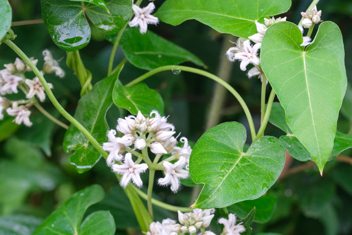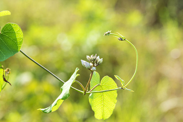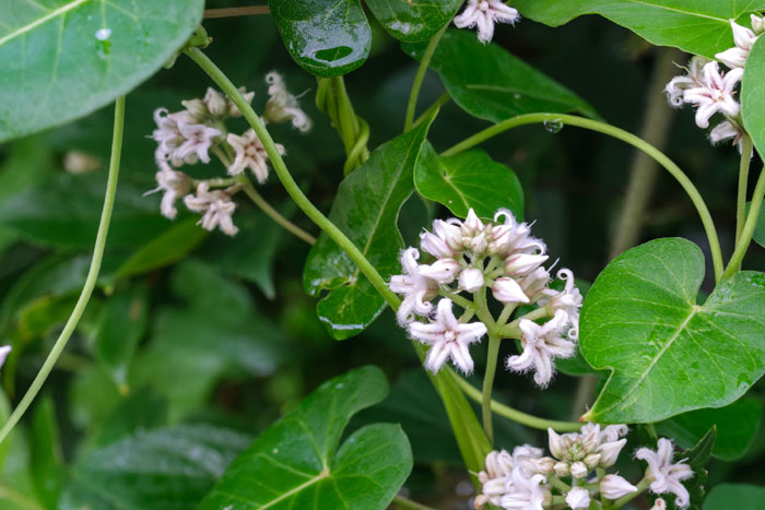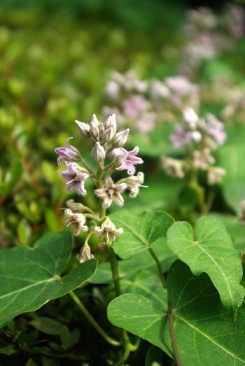 日当りの良い乾いた道端などに生え、ツルで他の植物に左巻きに絡みつく。茎を傷つけると有毒の白い乳液を出す。星形の花の内部に白い毛が密生する。花には甘い芳香がある。葉は対生するハート形。花の直径は約1cmと小さいが、10cmもある大きな袋果をつける。裂開して長い毛をつけた種子が風に舞う。北海道から九州に分布。