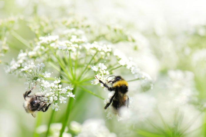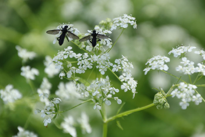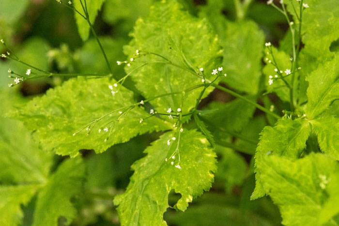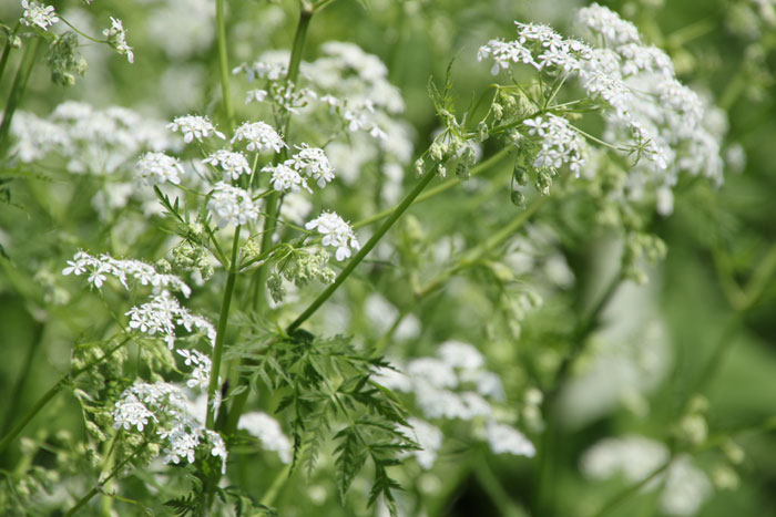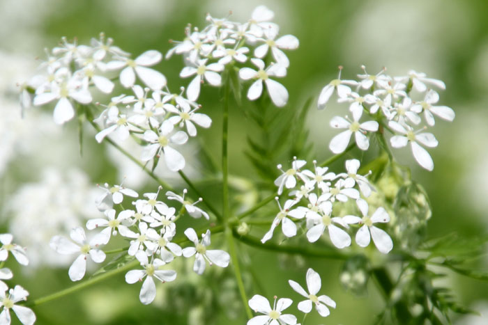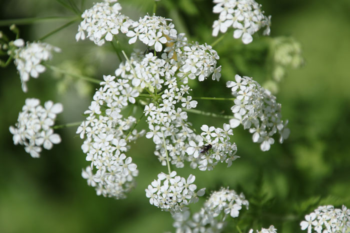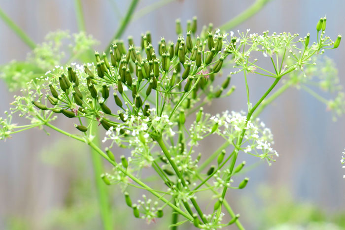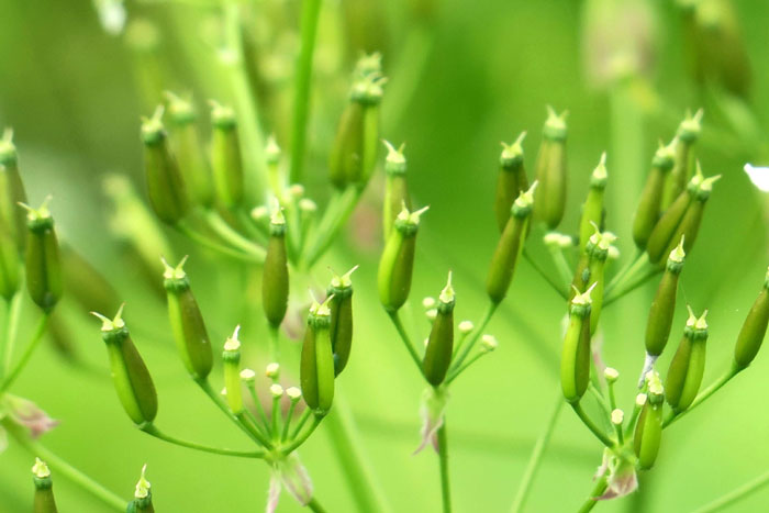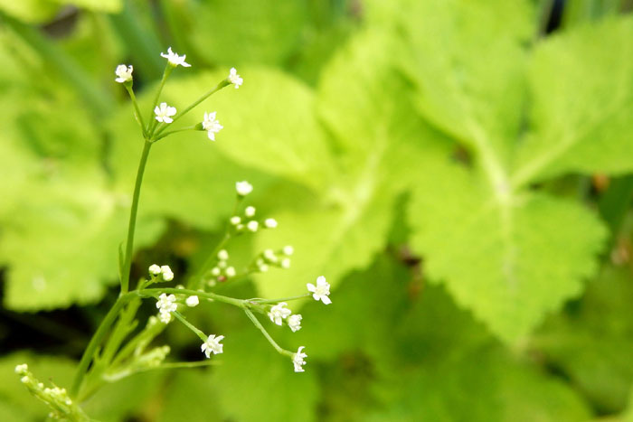 - 花・・・葉の先に複散形花序を出し、小さな白花を咲かせる。花弁は5個で、外側の2個が他より大きい。総苞片はない。小総苞片は数個あり下を向く。雄しべは5個。2個の花柱は外側に曲がる。