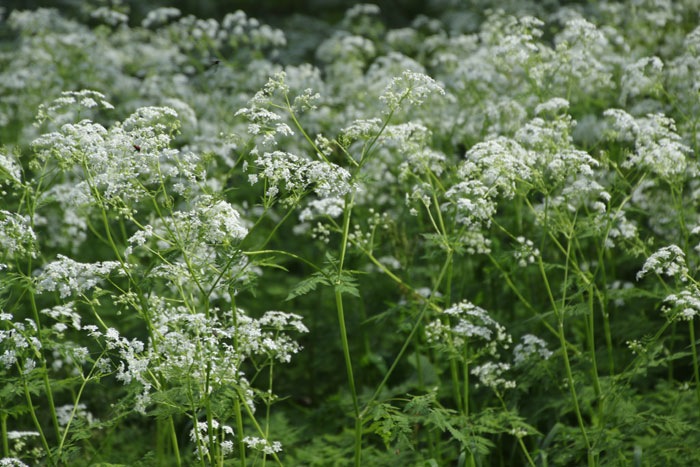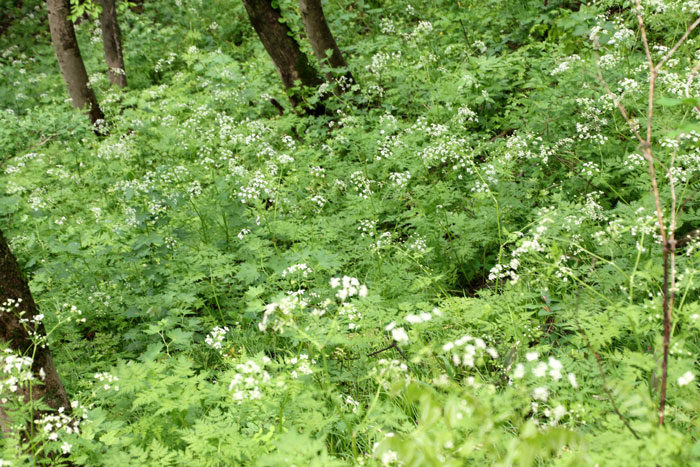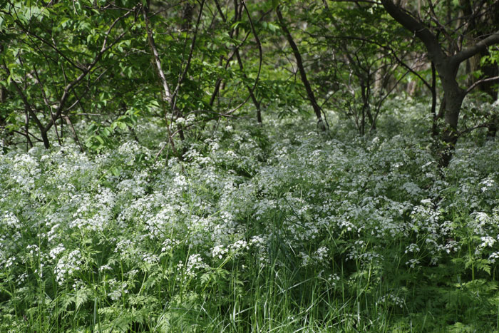 湿り気のある山地の林縁や林の下などに生え、一面を白く染めるほどよく群生する。葉は互生し、小葉は細かく裂けシダ類に似ている。葉をちぎると、セリのような良い香りがする。若葉は山菜として利用される。果実は円柱形で黒く熟す。北海道から九州に分布。