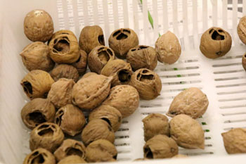 - ニホンリスがクルミを食べた食痕・・・樹木見本園に生息しているニホンリスお気に入りの食事場所には、クルミを食べた殻が山のように落ちている。写真のとおり、実がきれいに二つに割れている。リスは、クルミの縫合線に沿って歯を差し込み、時間をかけてパカッと二つに割ってから、中の美味しいクルミを食べる。