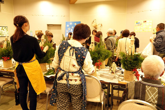 2019年12月21日(土)、「クリプトンの森の素材でつくるミニ門松」が秋田県森林学習交流館・プラザクリプトンで開催された。参加者は24名。門松は、新年を迎えるにあたり、今年一年の幸福をもたらす「歳神様」を迎える目印(依代)として玄関前や門に立てる。ミニ門松は、業務用の大きな缶を使い、松竹梅の三点セットと、ナンテン、ユズリハを使った本格的なものである。門松の由来からミニ門松に使われる縁起物、竹の切り口は二種類、いつ立てるの、しめ飾りの由来などについて記した資料も配布し、簡単な説明も行われた。