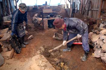 | 名人は、決して焦らず、丁寧に優しく出す口近くへと寄せてくる。引き出した炭は、小屋全体がパッと赤くなるほど熱い光を放つ。 | |||||||