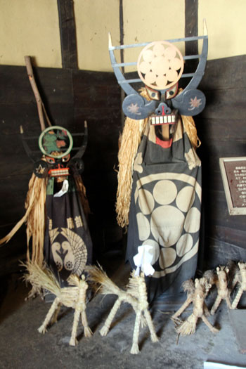 - 集落には必ず一軒の旧家があって、「オクナイサマ」という神様を祀っている・・・この神様の像は、桑の木を削って顔を描き、四角い布の真ん中に穴を空け、これを上から通して衣装としている。正月の十五日には、その地区の人々がこの家に集まってきて、この神様を祭る。