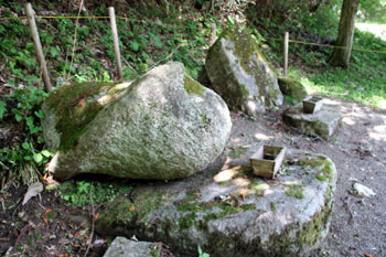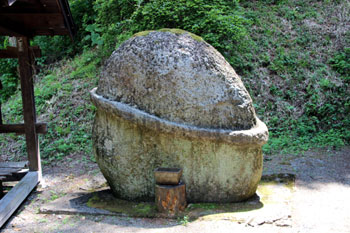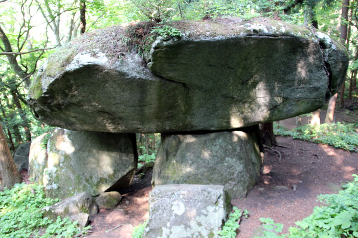 - 台石の上に横たわる長さ7mもの巨大「笠石」は南北を指し、その下の鳥居のような隙間は、太陽が昇るのを望むように東を指すという。だから原始時代の巨石文化遺跡ではないかと言われている。この東に位置する所に山の神の祠があり、安産の神として住民に信仰されている。