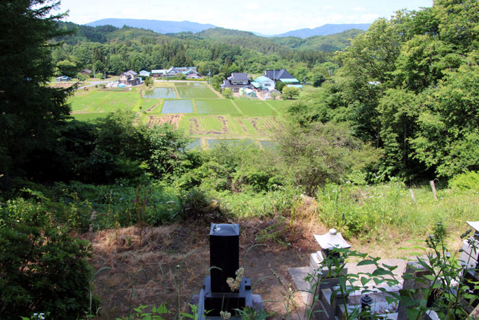 - ダンノハナ(共同墓地)から土淵村山口集落を望む
