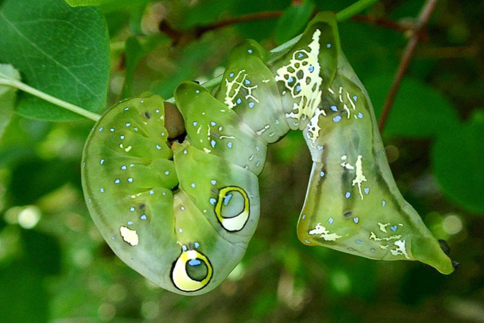 - アケビコノハ幼虫の目玉模様・・・幼虫の背中には、まるで目玉そっくりな眼状紋がある。刺激を受けるとその部分を持ち上げ、頭を内側に折り曲げるようにして威嚇する。アゲハやガ類の幼虫にも眼状紋はあるが、アゲビコノハの目玉はナンバーワン。これは、フクロウや蛇の目に似せて、天敵の鳥を驚かすためと言われている。