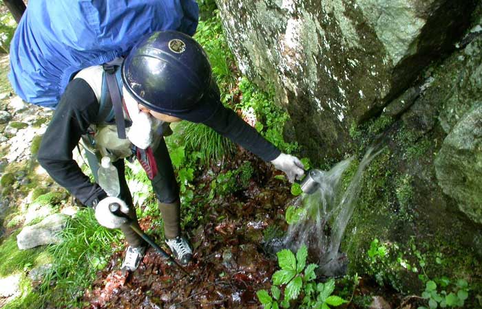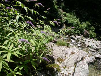 - 堀内沢の清冽な流れを右に左に渡渉を繰り返す。夏の暑い陽射しに汗も滴り落ちるが、清冽な流れに身を浸せば、その暑さも吹き飛ぶ。