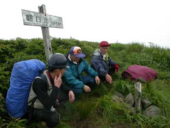 - 雨の中、最後の詰めで猛烈な薮こぎに喘いだだけに、このお花畑の草原に出た瞬間は、得も言われぬ開放感、感動が押し寄せてきた。しばし羽後朝日岳を見上げるも、濃いガスが流れて何も見えなかった。しかし、深い静寂と流れる濃霧に見え隠れする山並みを見ていると、原始の山・羽後朝日岳にふさわしい神秘的な景観だった。
