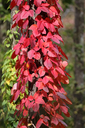 - 紅葉・・・秋、いち早く紅葉して美しい。木々を這い上り、幹全体を真っ赤に染めるので、遠くからでもよく目立つ