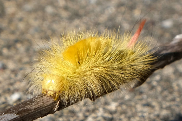 全身が黄白色の長い毛に覆われ、背中に歯ブラシのように毛の束が並ぶカラフルな毛虫。尾脚の上にも尻尾のような赤い毛の束を立てている。驚かせると、背中を丸め、毛の間に隠れていた黒い帯を見せる。毛に毒はない。黄色い繭をつくりサナギになる。