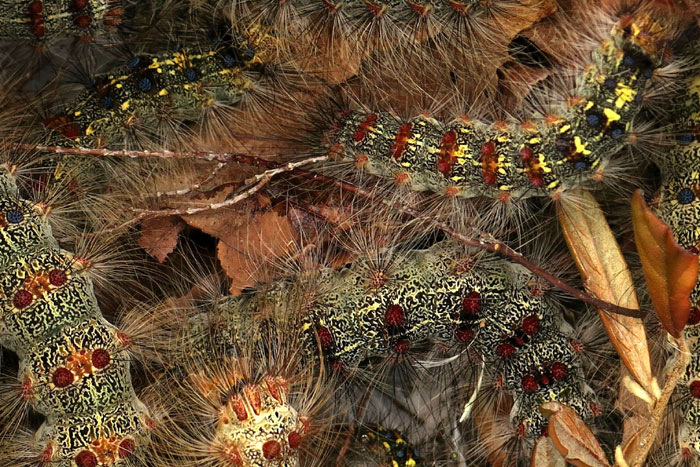 - オオトビモンシャチホコの幼虫・・・クリ、コナラなどの枝先に群がる。終齢は、赤と黒のまだら模様をしている。幼虫は5~6月に集団で葉を食べる.幼虫は刺激を与えると頭部を反らす習性がある。終齢幼虫は地上の落葉中や土の浅いところに潜って蛹になる夏に成虫になる.
