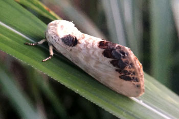 前ハネの地色はクリーム色で、特徴的な黒色紋がある。開張♂48~50mm、♀50~52mm。夏の終わりごろ、サクラにつく毛虫は、ほとんどがモンクロシャチホコである。幼虫は群生し、サクラやナシ、ウメなどの葉を大量に食べて育つ。蛹化が近づくと、列をつくって木を下る。北海道から九州まで分布。(写真提供 神吉隆行氏 HP「K's life list」)