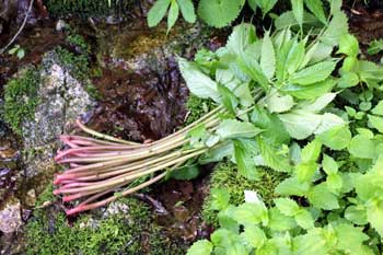 - ミズ(ウワバミソウ、太平山系)・・・ミズは、春から秋まで長い期間食べられるだけに、最も利用されている山菜の代表格。9月頃になると、茎と葉の付け根に小さな丸いムカゴ状の実がつく(右の写真)。秋田ではミズのコブコと呼んでいる。カモシカは、ミズのコブだけを選り分けて食べるくらいで、人間にとっても大変美味い。
