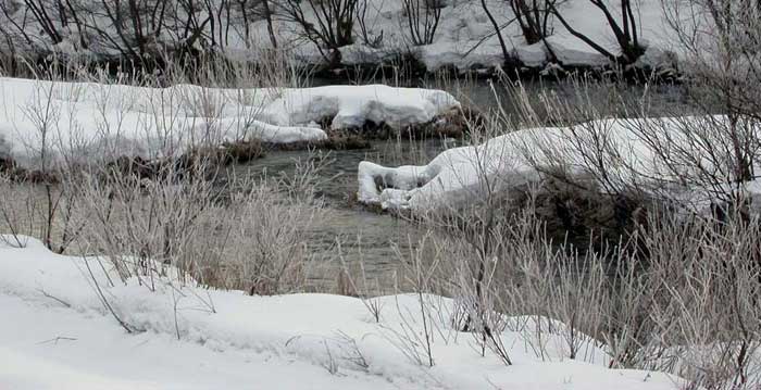 - 初冬の渓流(太平山系)・・・渓に降り積もった雪と冷たい流れ・・・イワナたちは産卵を終え、大きな淵で越冬する。クマは、雪が積もると、立ち木にできたウロ、倒木や根上りがつくる穴、土穴、岩穴などで越冬する。
