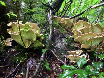 - 盆キノコの代表・トンビマイタケ(白神山地)・・・キノコ採りのプロは、8月上旬頃から山に入り、ブナの老木に大量発生するトンビマイタケ採りからスタートする。トンビマイタケを採りながら、ブナの森に頻繁に入り、キノコの王様・マイタケが発生する時期を読むのである。