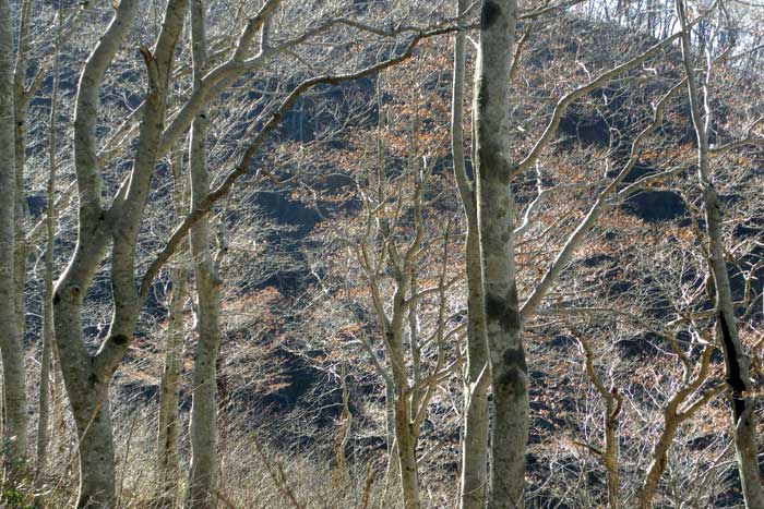 - 晩秋のブナ林(白神山地、藤里町)・・・山里に初霜が降り、秋も深まれば、ブナの森は黄葉から褐色へと変化してゆく。林床には、ブナの実が一面に落下し、迫り来る冬に備えて、野生動物たちの貴重な餌となる。