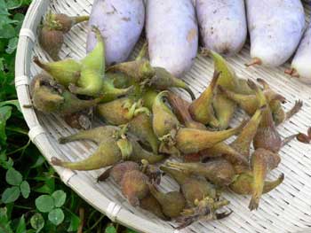 - 低木に3〜4個の実が角のような奇妙な形(左の写真)をした実をつける。皮を剥くと、右のミニ栗のような実が入っている。フライパンで焼き、硬い殻を割り、爪楊枝でほじくりながら、白い種子を食べる。栗の味に似て、なかなか美味い。
