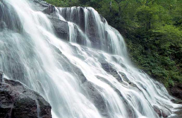 - 錦繍の赤水渓谷兎滝(森吉山系、北秋田市森吉町)・・・赤水沢入渓点から兎滝まで約3kmも一枚岩盤のナメ床、ナメ滝、大小の甌穴が続く。ナメとは、川床一面が岩盤になっていて、その上を水の流れが滑るように走っている状態をいう。ナメ床とは、ナメを走らせている岩盤のことで、天然の舗装道路を歩いているように快適である。