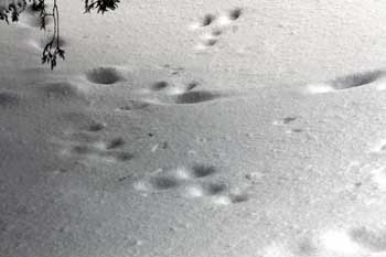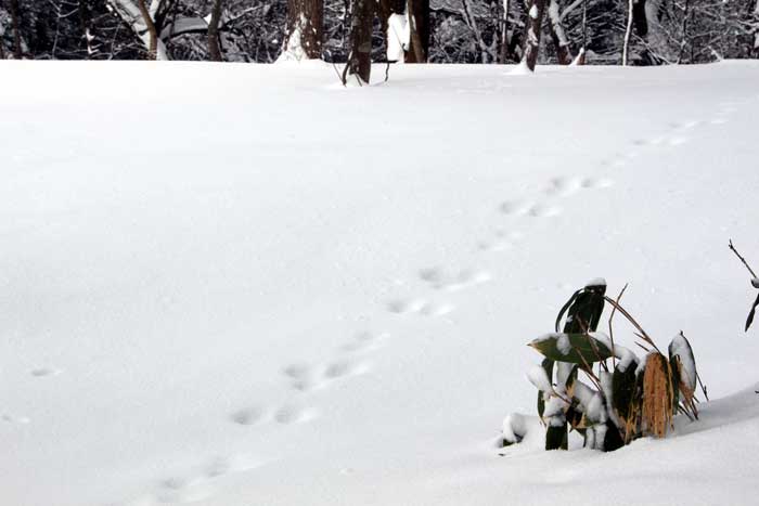 | 左下から右へ歩いた足跡はキツネ、右下から左上へ矢印型の逆方向に歩いている足跡はキジ。どちらが先に歩いたかを推理すれば・・・キツネは匂いを嗅いで食べ物を探す習性があるので、キジが歩いた後に歩けば、交差する周辺で必ず足跡が乱れる。ところが、その痕跡はないので、キツネが先に歩いた後、キジが歩いたことが分かる。 | |||||||||