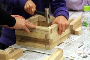 | ▲かんじき体験の後、木工クラフト体験(オリジナル鉢カバーづくり)も行われた。 | |||||||||