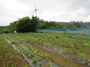 - 苗畑の目印になる象潟IC近くにある風力発電施設も結構な強風の中勢いよく回っていました。ブナの苗木もすっかり葉が広がってきました。