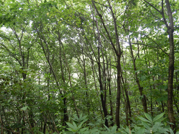 - 林内にあちこちマウントがあり、昔の畑跡地かと思いましたが、バイオ桐の跡地を森林組合が整備して、ならした表土を寄せた結果だそうです。かなり前から広葉樹の植樹を行っていたそうで、平成20年の標柱もありました。ミズナラ、ブナ、ヤマザクラ等様々な樹種を植えたということですが、立派に成長してかなり混み合って競争により枯れ始めている樹もあります。