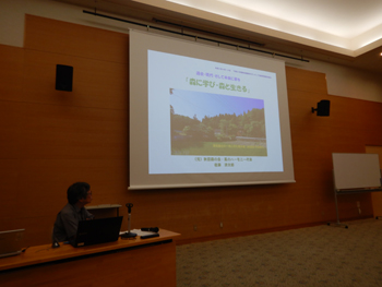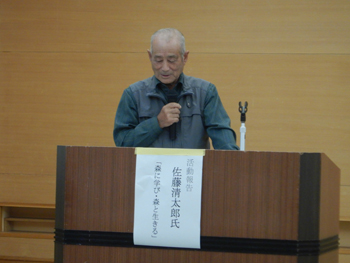 - 活動報告では、佐藤清太郎氏から、「森に学び・森と生きる」と題して、ご自分の幼少期の話しから、ボランティア団体「秋田森の会・風のハーモニー」立ち上げの経緯、活動内容、自分の森林経営に対する思い、などが語られました。風のハーモニーで事務局だった斎藤さんも来ていただきました。