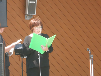 - ミス日本みどりの大使の安藤さんと森っちが見守る中で矢島小学校の6年生がメッセージを朗読し、最後に来年の開催地である男鹿市の菅原市長からPRのあいさつがあり式典が終了しました。